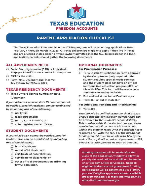 The long-awaited day is here. The Texas Education Freedom Account (TEFA) applications open now. Detailed information on how to register, what documentation is required, and the link to apply can be found here.